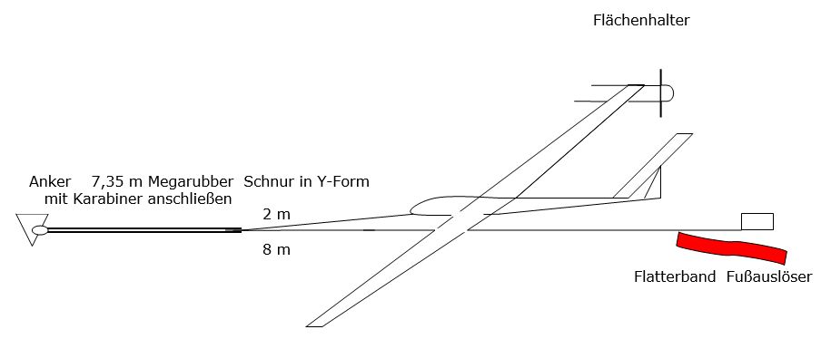 Durch das hintereinanderkoppeln der Gummistränge kann auch ein Hochstart in der Ebene für Höhen bis ca. 70 m vollzogen werden.